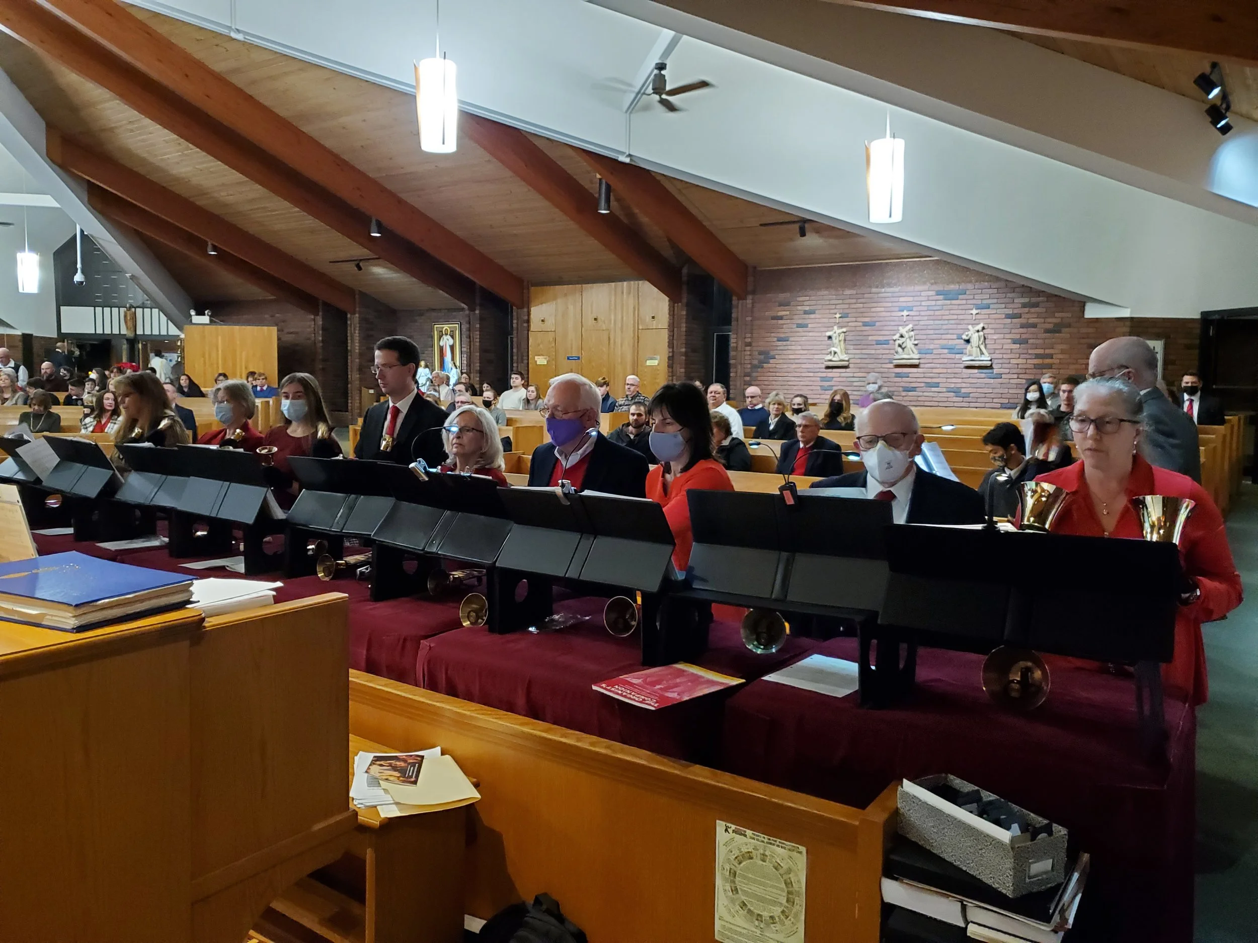 The Handbell Choir is open to anyone who has the desire to work hard and have fun! The group rings at various Masses throughout the year, including special Holy Days. Music reading skills are helpful but not required. The choir rehearses weekly on Wednesdays from 5:30-6:30pm
